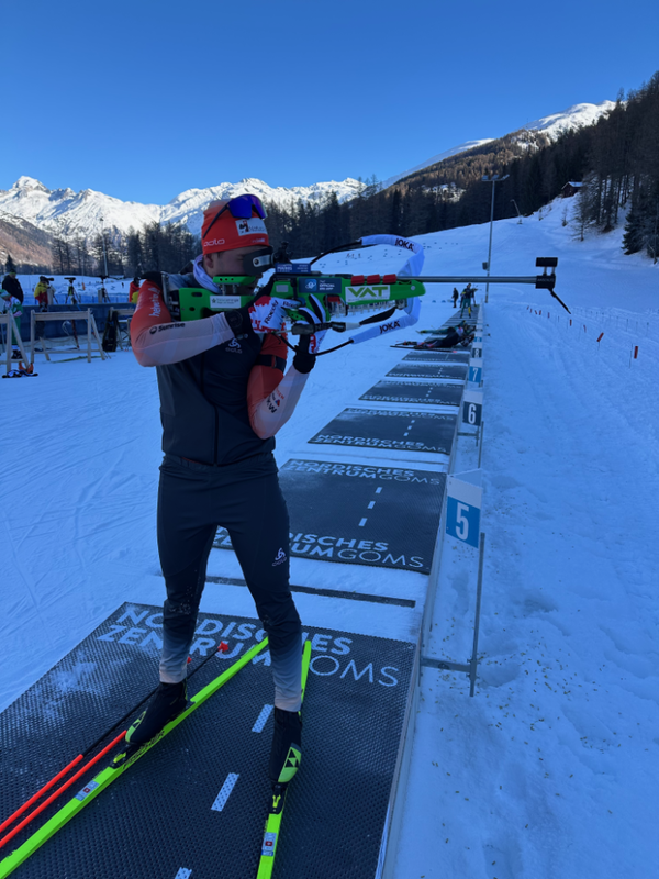 Purtroppo, finora non è andata esattamente come speravo. A novembre mi sono preso due infreddature e non ho potuto allenarmi come avrei voluto. Per questo motivo non ho potuto partecipare alle prime gare di selezione. Fortunatamente, a fine novembre ero di nuovo in forma e ho potuto prendere parte alla prima Swiss Cup della stagione. Purtroppo, però, non sono riuscito a concludere la prima gara a causa di una caduta – per fortuna senza conse-guenze, solo danni materiali! Il giorno successivo sono riuscito a ripartire senza problemi e, grazie a una solida prestazione nel tiro e nella corsa, ho vinto la gara. Così sono stato sele-zionato per la IBU Junior Cup, una competizione internazionale per atleti under 21.