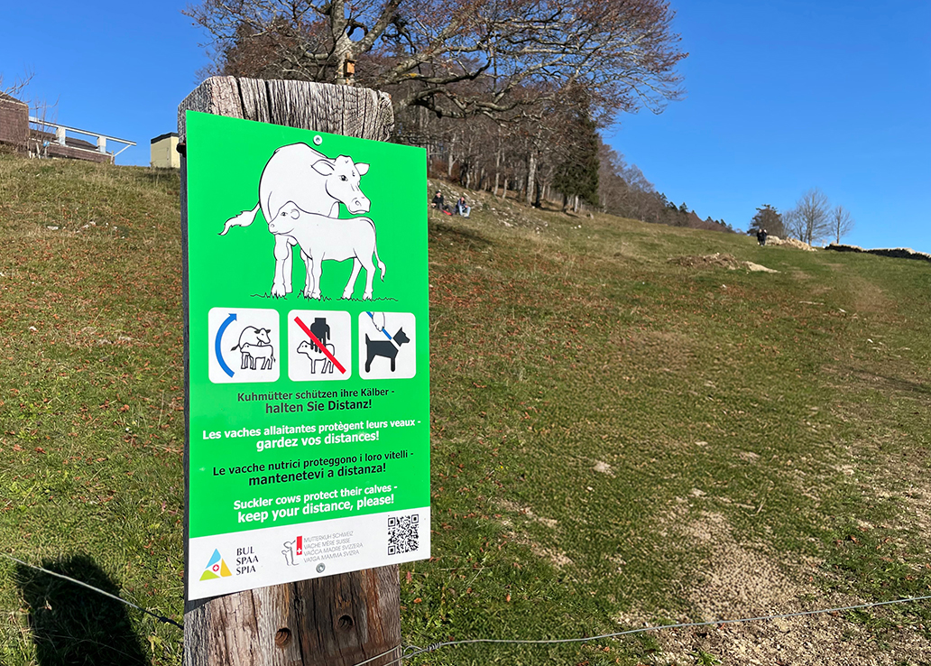 Si une vache ou même tout le troupeau se trouve sur le chemin pédestre ou aux alentours, il faut faire un grand arc de cercle pour contourner les animaux. Les points suivants doivent être respectés :