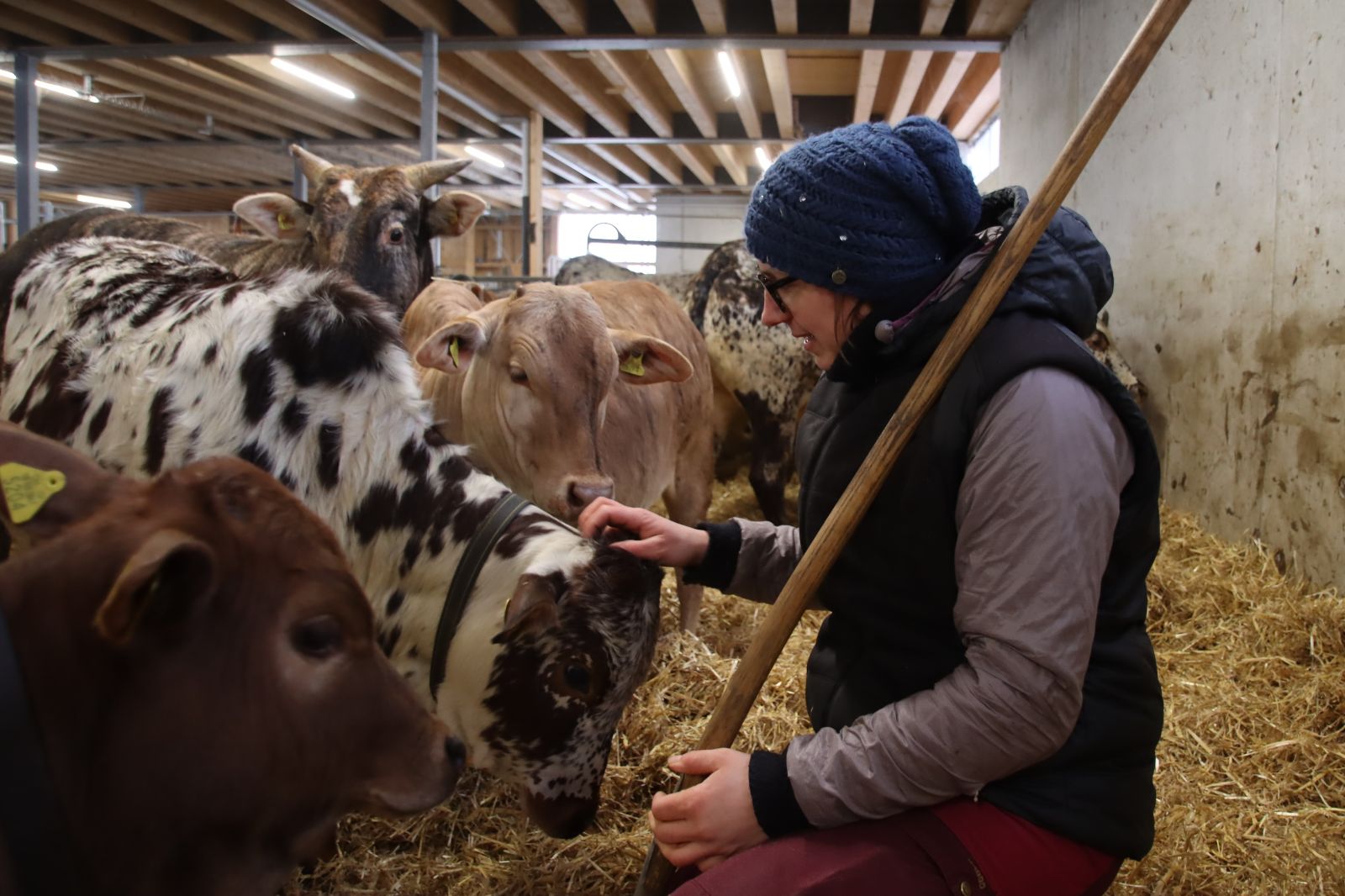Obwohl ich Rebekka Strub kaum kenne, ist sie mir schnell vertraut. Sie strahlt eine grosse Zufriedenheit und Lebenslust aus. Das ist ansteckend. Diese Ansteckung scheint sie auch auf ihre Tiere zu übertragen. Als ich an diesem Tag erstmals den Stall betrete, spüre ich gleich diese Ruhe. Rechts die 30-köpfige Aubrac-Herde mit einem hübschen Muni, links hinten die 40-köpfige Zebu-Herde mit ihrem Muni und links vorne die rund 25 Burenziegen mit einem Bock. Total unaufgeregt beäugen sie die Neue und sind gespannt was da kommt. «Du wirst sehen, die Zebus sind sehr neugierig und aufmerksam». Rebekka lädt mich ein, die Herde näher kennen zu lernen. Ich zögere keinen einzigen Moment. Sie kennt ihre Tiere so gut. «Es gibt eine einzige Zebukuh in der Herde, die ich etwas beobachten musste, wie sie auf dich reagiert», verrät sie mir später.